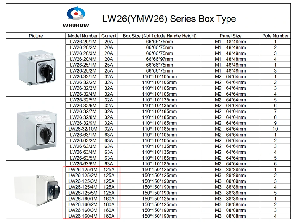 YAMING, fabricant chevronné avec plus de 30 ans d'expertise dans la fabrication d'interrupteurs électriques, présente le commutateur à came étanche LW26 125A 160A (modèle interne : YMW26-125M 160M) équipé d'un boîtier étanche. Il offre une excellente adaptabilité à diverses conditions de travail, des fonctions polyvalentes et des performances de sécurité élevées, ce qui en fait un choix idéal pour le contrôle de circuits, le contrôle de moteurs, les équipements de test et les scénarios de contrôle principaux.
