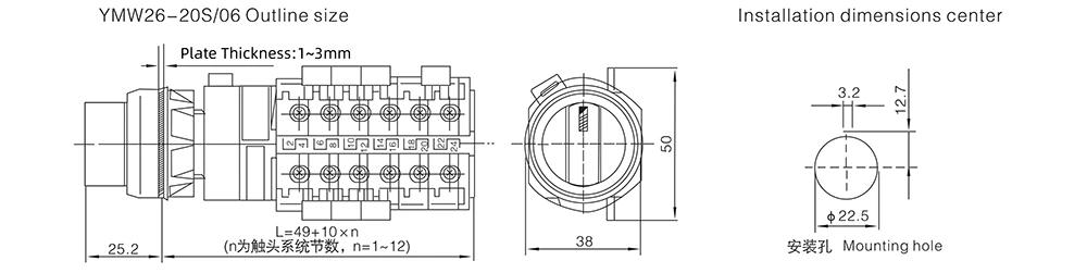 L'interrupteur à came à montage central monotrou 20 A (modèle interne : YMW26-20S) est un composant de commande électrique haute performance développé indépendamment par YAMING, un fabricant chevronné avec 30 ans d'expérience dans l'industrie des interrupteurs électriques. Conçu pour les circuits AC 50 Hz (jusqu'à 690 V) et DC 240 V (courant nominal jusqu'à 20 A), ce commutateur présente une structure compacte, des performances fiables et une excellente adaptabilité.