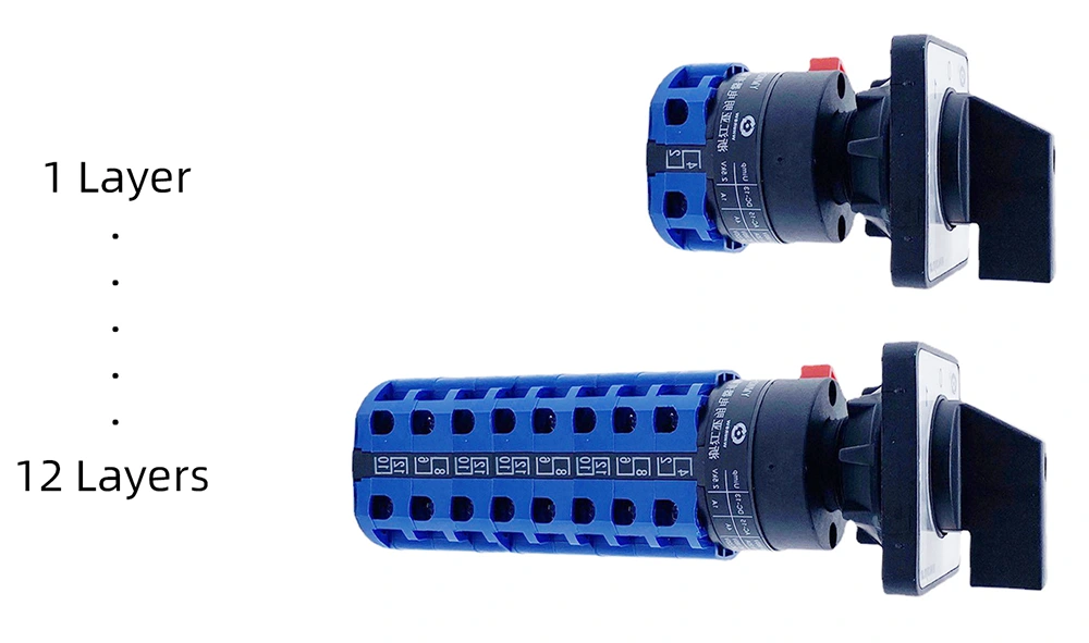 - Composants du système : options de couches flexibles – 1 à 12 couches pour les commutateurs de positionnement, 1 à 3 couches pour les commutateurs à réinitialisation automatique et 1 à 6 couches pour les commutateurs de commande de moteur.