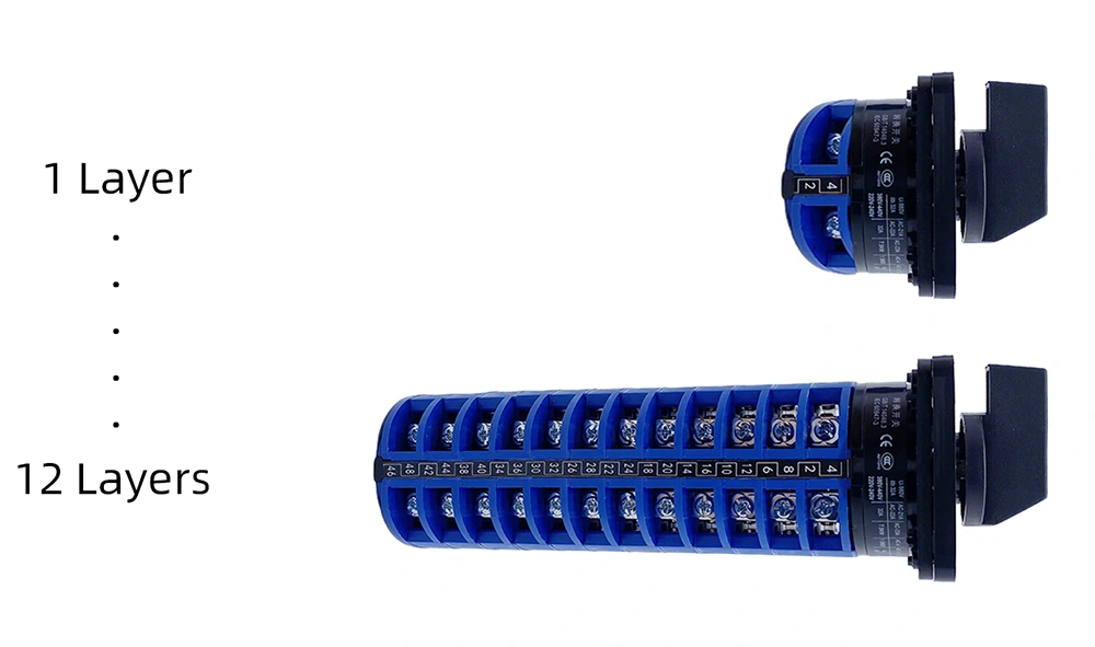 Et ce commutateur à came rotatif 32A peut être personnalisé (de 1 à 12 couches) :