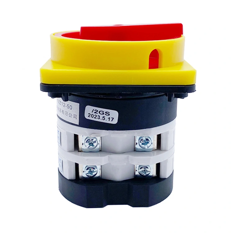 Ce commutateur à came rotatif combiné à deux positions OFF-ON de 50 A (modèle interne : YMZ12-50GS) est conçu pour les systèmes électriques AC 50 Hz, avec une tension nominale allant jusqu'à 690 V AC et 240 V DC, et un courant nominal de 50 A.