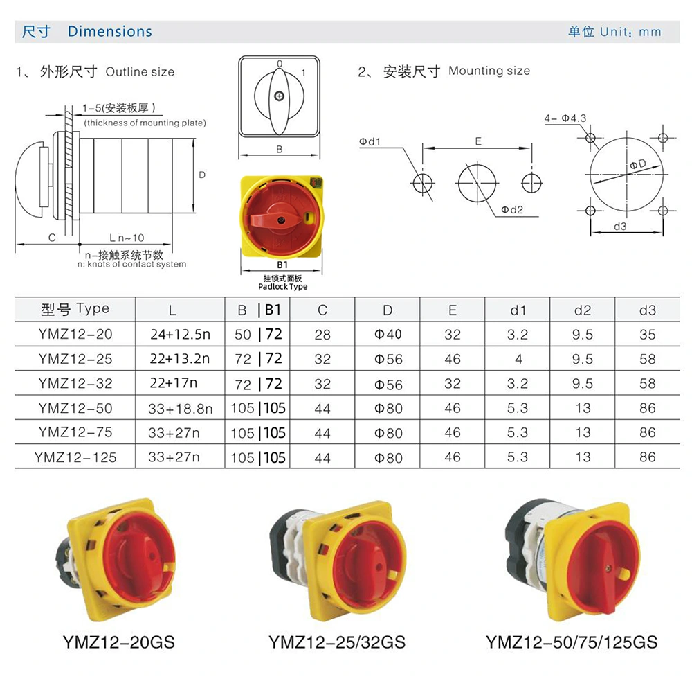 Avec plus de 30 ans d'expertise professionnelle, Zhejiang Yaming Electric est l'un des principaux fournisseurs d'interrupteurs électriques de haute qualité. Tirant parti d'une forte solidité technique et d'un système complet de gestion de la qualité, nous sommes ravis de présenter notre interrupteur à came rotatif à combinaison à deux positions avec cadenas 50A (code interne : YMZ12-50GS). Doté d'un savoir-faire exquis et d'une technologie de pointe, il est équipé de fonctionnalités anti-dysfonctionnement pour garantir un contrôle de circuit stable et efficace pour les utilisateurs industriels du monde entier.