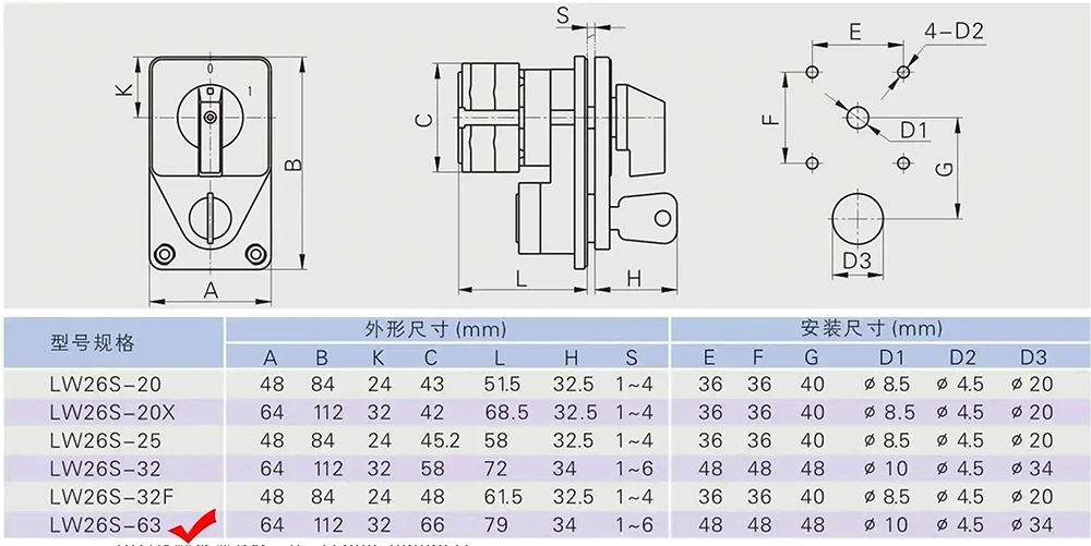 YAMING, un fabricant professionnel d'interrupteurs électriques avec plus de 30 ans d'expertise approfondie, lance le commutateur à came de changement de commande à clé LW26 63A (modèle interne : YMW26-63YS4) en Chine. Il est applicable aux circuits AC 50 Hz avec une tension nominale ≤ 690 V et aux circuits DC avec une tension ≤ 240 V, supportant un courant nominal de 63 A. Avec une conception compacte, des fonctions complètes et d'excellentes performances de sécurité, il est largement utilisé dans les scénarios de conversion de circuit principal, de contrôle direct de moteur, de contrôle de commande et de mesure, et peut s'adapter à divers environnements de travail difficiles.